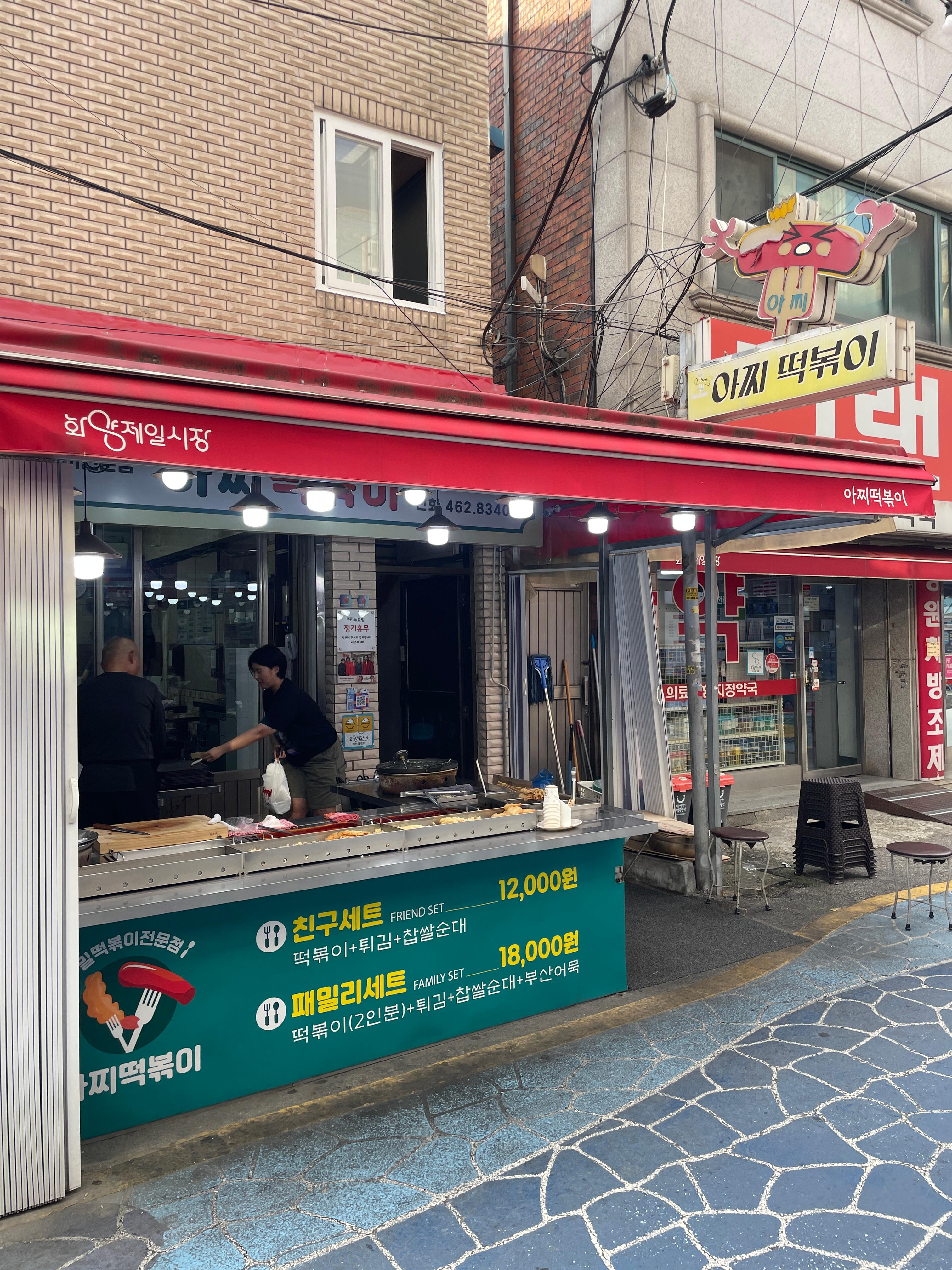 화양시장 입구부터 활기가 넘쳤다. 과일가게, 반찬가게, 정육점이 즐비한 사이로 걷다 보니 빨간 간판이 보였다. '아찌떡볶이'. 이름부터 정겹다.